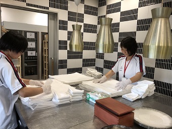 結婚式場でテーブルナプキンの準備