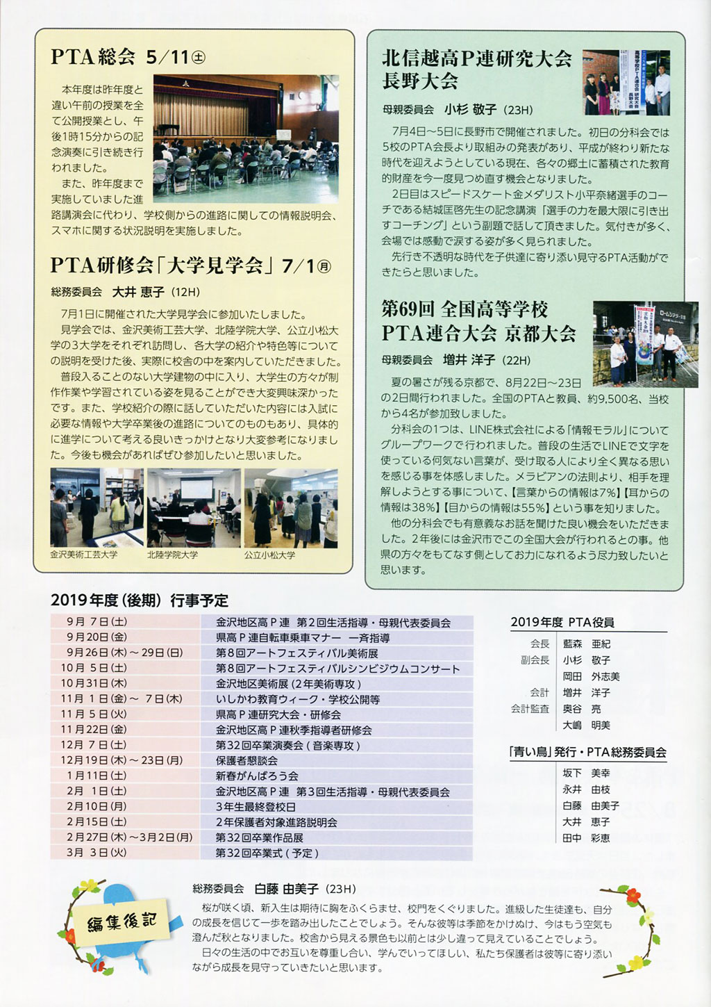 PTA広報誌「青い鳥」第41号を発行しました。 投稿日時 : 2019/11/18 tatsuh PTA広報誌「青い鳥」第41号 2019年10月を発行しました。広報誌の拡大表示表紙|ページ1|ページ2|ページ3 Tweet