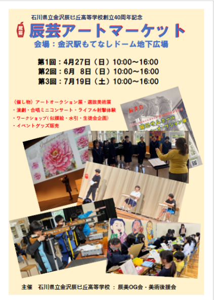 辰芸アートマーケット 投稿日時 : 05/15 金沢辰巳丘01 4/27(日)、6/8(日) 、7/19(土)の3日間、金沢駅もてなしドーム地下広場にて「辰芸アートマーケット」を開催します。いずれも10:00~16:00までですので、ぜひお立ち寄りください。