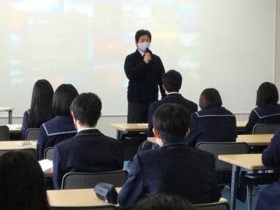 1月14日(金)の4限目に、明日とあさってに共通テストを受験する生徒の激励会がありました。教頭の赤尾先生、3年担任の竹内先生、田村先生、角井先生、音楽の別宗先生の順に激励の言葉がありました。その後に進路指導課長の野村先生から受験場での注意がありました。