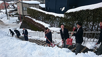 本校では積雪時、クラスや部活動単位での除雪が計画されています。これまでも朝、学校前の除雪は毎日のように行ってきましたが、今回の大雪で、本校周辺は大変な積雪となり、放課後の除雪隊も稼働しました。写真は末町住宅街で除雪車の入らない通路の除雪を行っている様子です。