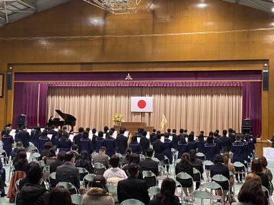 今年度は新型コロナウィルスに対しての政府からの緊急要請のもと、多人数が一堂に会する場での感染を防ぐ対策を講じながら実施しました。在校生の参加がなく、来賓の方々の出席も縮小し、保護者等の参加人数にも制限を設ける中での卒業式となりましたが、代表生徒による国歌独唱、学生歌「大きな明日へ」斉唱と続き、辰巳丘らしい雰囲気のなか、卒業一人一人が明るく元気にしっかりと学び舎を巣立っていきました。