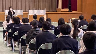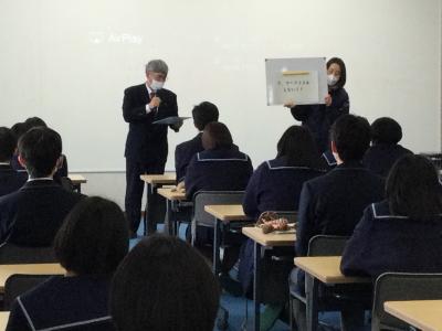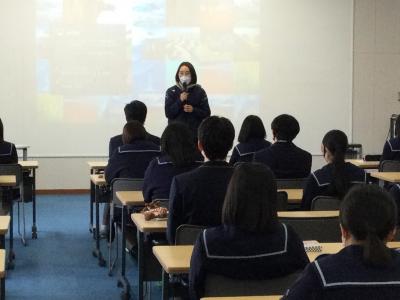 1月11日(火)の7限目に1年「総合的な探究の時間」の特別講座として、MROアナウンサー西尾知亜紀氏をお招きし、「アナウンサーから相手にわかりやすく伝える技を学ぼう!」を演題として、講義と実習を行いました。