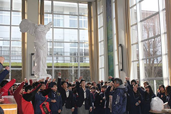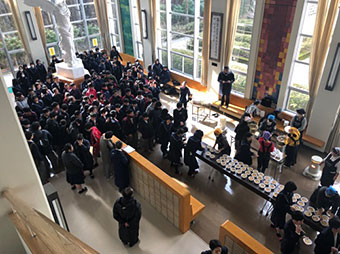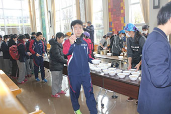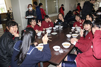 1月12日(土)、昨年とは打って変わって雪のない穏やかな陽気の中での実施となりました。3年生は、1週間後のセンター試験に向けての補習に臨み、部活動所属の1・2年生は永安寺へ初詣に訪れ、各部の練習(運動部は合同で、インストラクター指導によるエクササイズ)の後で、各部の部長が今年度の抱負を発表しました。その後、PTAが準備した食事(めった汁、おにぎり、ぜんざい、漬物)を堪能し、あっという間に完食となりました。きつめのエクササイズの後、おなかをすかせ笑顔で「おかわりできますか?」と多くの生徒が楽しんでいました。早朝から準備にご協力いただいた保護者の皆様、ありがとうございました。今後ともPTA活動へのご支援・ご協力をお願いいたします。
