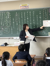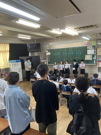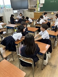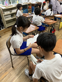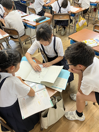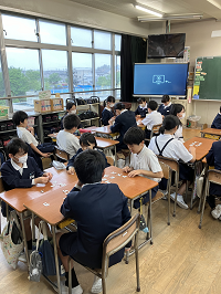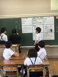学校全体でよりよい授業づくりをめざすために、一つ上の学年の授業を見学に行き、自分たちの授業に生かすことをねらいに授業交流を行っています。この日は1年生が2年生の授業を見学に行きました。