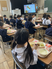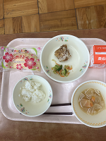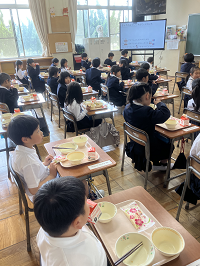 はじめての給食なのに配膳の仕方がとても上手でした。「小学校の給食はおいしいなあ」という声でいっぱい。特に「おめでとう」と入ったクレープが大好評でした。