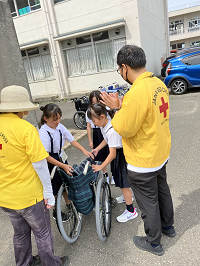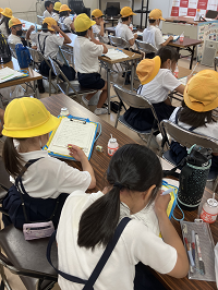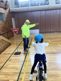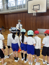 3年生から自転車で行ってもいい範囲が、これまでの「自分の町内」から「校区内」へと広がります。この日は、能美警察署と交通安全協会のご指導で、特に自転車における安全確認の大切さをしっかりと学びました。