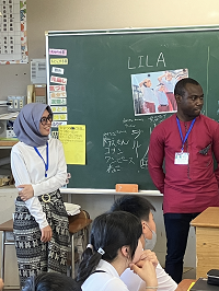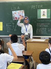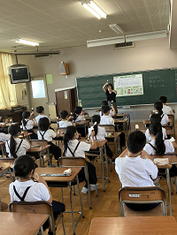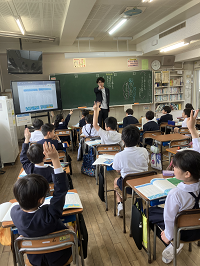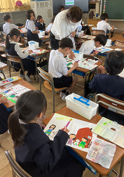 3年生から6年生は学期に1回、JAISTの留学生を招いて英会話を通しての国際交流を行っています。みんなが学んでいる英語、十分に伝わっていて楽しいコミュニケーションができています。