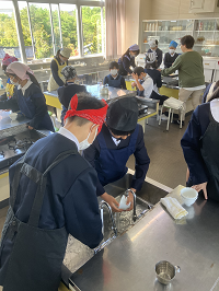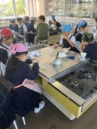 5年生が家庭科の学習で初めての調理実習を行いました。内容は、お湯を沸かしてお茶を入れて飲むというもの。調理室の使い方や安全上のルールなどもしっかりと学びました。