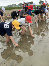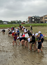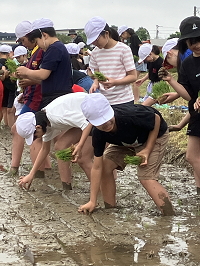 5年生は、総合的な学習の時間を「ふるさと農業未来プロジェクト」と名付け、食の大切さや農家の苦労や工夫について探求する中で、これからの食や農業について考える学習に取り組みます。この日は、サンゴウ会様のご協力の下、田植え体験を行いました。
