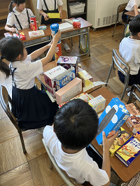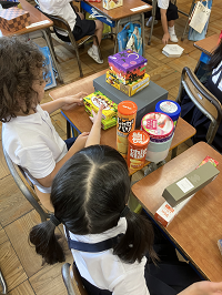 いろいろな箱をもちよって、仲間分けをしました。これは四角い箱。これは転がる形の箱。これは長い箱、これは平べったい箱など、、、。このように立体分別の基礎を身に付けていきます。