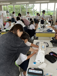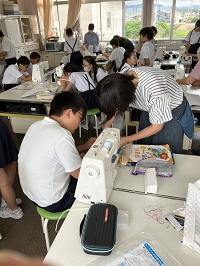 学校運営協議会のご協力で、この日は6年生のミシンの学習に地域の先生に入っていただきました。個別の困り感に丁寧に寄り添っていただき、ミシンに慣れない子もスムースに楽しく作業をすすめることができました。