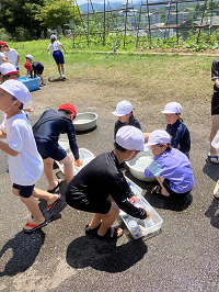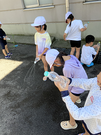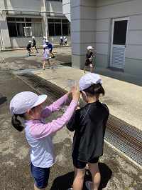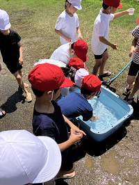 1年生生活科の「夏がやってきた」で水遊びを行いました。夏という季節を考慮して「どんな道具を使って、どんな遊びをしようか」とそれぞれが考え、楽しく実践してみました。