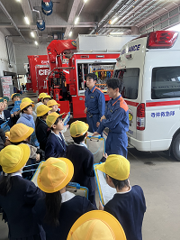 3年生は社会科の学習で消防署の見学に行きました。目の前にある消防車の迫力にワクワクしながらも、火事から私たちのくらしの安全を守るための工夫や努力についてしっかりと学びました。