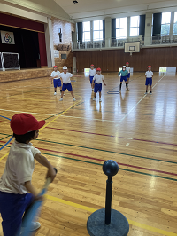 Tボールはベースボール型のニュースポーツです。打ったり投げたり捕ったりという技能の習得と共に、「全員が楽しくゲームができる」ことをめあてに自分たちでルールを決めながら楽しんでいます。