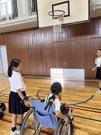 ボランティア団体であるチーム20のご協力で、車いす体験、アイマスク体験を行いました。この体験を通して、障害を抱える人が感じる苦労や、サポートする人が気をつけたい留意点などを考えました。