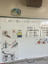 5年生が家庭科の学習で初めての調理実習を行いました。内容は、お湯を沸かしてお茶を入れて飲むというもの。調理室の使い方や安全上のルールなどもしっかりと学びました。
