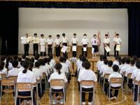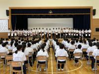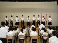はじめに各種大会の表彰披露が行われ、ステージいっぱいに表彰者が並び、全校でその頑張りを称えました。また、県大会に出場する選手の代表者から決意が語られ、今度はエールを送りました。