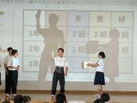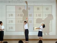 全校集会のあとは、10月の運動会に向けた団抽選会がありました。どの団になるのか、どのクラスと同じになるのかみんなドキドキしながら抽選を見守りました。
