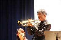 大野俊三氏講演会 投稿日時 : 2018/11/01 管理者 11月1日(木)、文化祭の前に、ジャズトランぺッターの大野俊三氏に「負けない心」をテーマにご講演いただきました。交通事故に巻き込まれ唇に大けがを負い、それを克服したと思ったら今度はがんに侵され、それでも苦しい手術やリハビリに立ち向かい、再びステージに復活した大野さん。自分の人生は自分で決めること、自分がしたいと思ったことを一生懸命やること、自分をがんばったねとほめること・・・など、たくさん教えていただきました。最後に、虹は希望の象徴、雨が降らないと虹は出ないよとお話しされ「オーバー・ザ・レインボー」を演奏してくださいました。ジャズトランペットの音色が大野さんの今日の言葉とともに心にしみました。 文化祭の写真等は、また次回になります。お楽しみに。