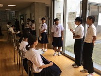 職場体験発表会 投稿日時 : 2018/09/25 管理者 9月25日(火)、5,6限に、1,2年生合同で職場体験発表会を、体育館や教室を使いポスターセッションの形で行いました。2年生は、職場体験の様子や学んだことを1年生にわかりやすく伝え、1年生は来年の自分たちの体験をイメージしながら聞くというものです。2年生全員が発表し、1年生全員が質問や感想を述べました。それぞれ、次につながる会になりました。