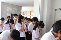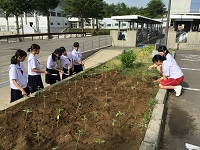 7月4日から降り続いた大雨で辰口中校区にも避難勧告が発令された地区がありましたが、何事もなくよかったです。先週、選挙管理委員会の人たちが植え替えたひまわりは、大雨にも負けずすくすく伸びています。その横でアカンサスも花をつけていました。アカンサスの葉は校章と同じ形です。確かめてみましょう。