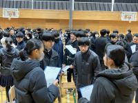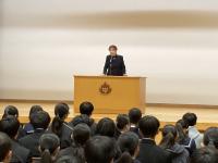 校長先生からは、2学期を振り返って、行事や部活動、授業などたくさんの場面で仲間とともに意欲的に活動する姿を見られたことや、冬休みに向けて、3年生は進路実現に向けて時間を無駄にせず有効に使ってほしいこと、1・2年生は次年度に向けて今できることや今すべきことについて考えてほしいことなどのお話がありました。