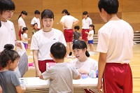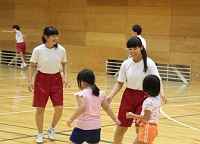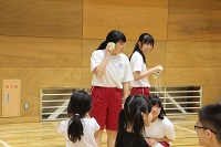 3年家庭科 保育園交流 投稿日時 : 2019/07/18 管理者 7月8日に緑が丘保育園、11日に辰口保育園、12日に国造保育園の園児さんたちが本校に訪れ、3年生の家庭科の学習の一環として保育園交流を実施しました。校内を案内し、その後第一体育館で準備したおもちゃで交流しました。園児の目線で話したり、園児の速さで歩いたり、おもちゃやゲームで楽しんでもらえるように一生懸命でした。園児さんも3年生も素敵な笑顔がみられました。