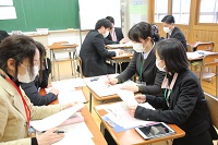 教員研修 投稿日時 : 2019/01/30 管理者 1月23、29日、先生方の研修として研究授業を行い、指導主事の先生方にご指導いただきました。授業は、岩﨑先生の社会科(1年4組)、三宅先生の英語科(1年2組)、斉田先生の理科(2年1組)です。インフルエンザ対策でマスクを着用していますが、生徒たちは元気にしっかりと授業に取組んでいました。授業後の協議会では、よい授業をつくるためにグループで話し合ったりホワイトボードを使い説明したりと生徒の皆さんが普段の授業でやっていることを体験しています。生徒目線を大事に「わかる&できる授業」目指して教員も頑張ります!