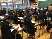 始業式の午後、1,2年生は書初めをしました。1年生は「不言実行」、2年生は「新たな目標」。各学年、心新たに落ち着いて紙に向かっていました。3年生は私立高校の願書の下書きをしました。私立入試は2月1日です。体調管理に留意し頑張ってください。