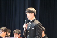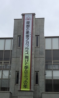 2月25日、生徒総会がありました。今年度を振り返っての改善点の確認や3年生から1.2年生へのエール、生徒会長から校歌をしっかり歌おうというメッセージもありました。また、ライトコートに校歌の一節の懸垂幕をさげました。「理想の象徴アカンサス」は生徒の好きな歌詞です。
