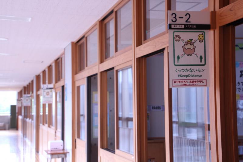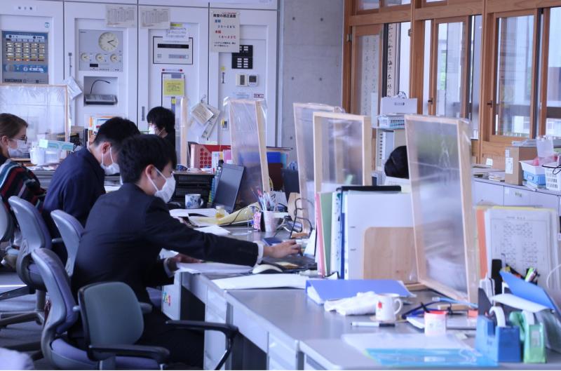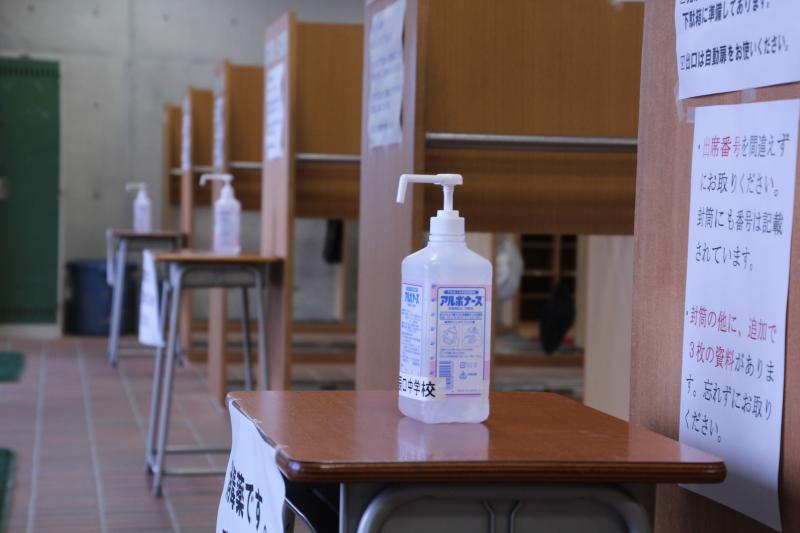 6月1日(月)の学校再開に向けて分散登校が開始しました。初日の今日は各クラスの出席番号奇数の生徒が登校してきました。教室が少し寂しい感じはしますが、生徒たちは久しぶりの学校がうれしいといった様子でした。感染拡大防止対策としては新たに注意喚起の校内掲示物を増やし、手洗い場の密集を避ける工夫をしました。先生方も職員室の密集を避けるため、現在会議室を臨時の職員室として業務を行っています。
