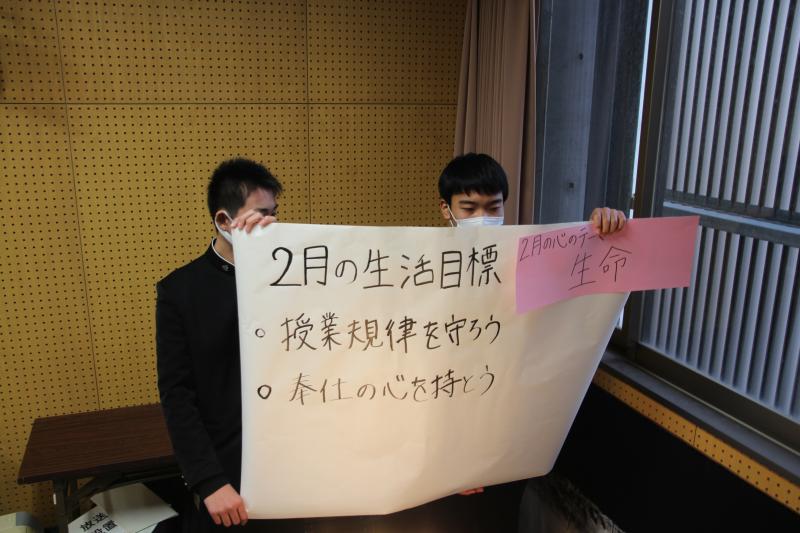 2月1日(月)2月の月例集会がありました。生徒玄関前の除雪作業のボランティアの生徒の行動に対する感謝や今月の心のテーマ「生命」について一人一人を大切にしてほしいとの話がありました。また、卒業式まで39日、3年生の卒業と同時に2年生が最高学年となことを再確認し、皆がそれぞれの立場で自覚する機会となりました。