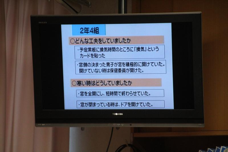 保健委員会からは、1月に行った換気活動の取組についての報告がありました。優秀な学級の取り組みをスライドを使って全校に紹介し今後も換気を徹底していくよう声かけがありました。
