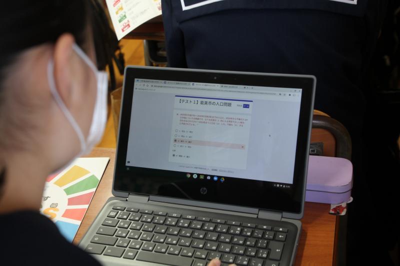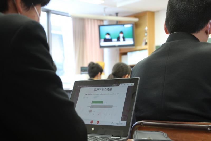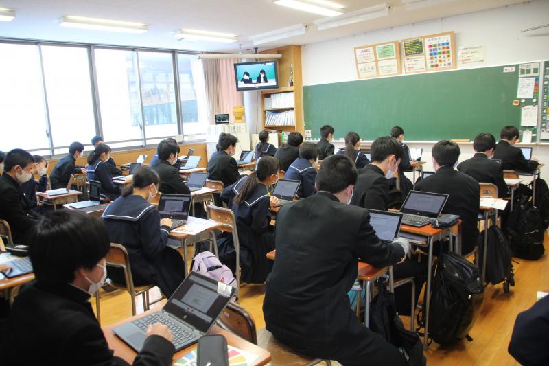 2月19日(金)、3年生が「能美市がめざすSDGs」について学習しました。市長戦略室の吉田様をお招きし、谷口教諭とオンラインで授業をしていただきました。この授業のために社会科の岩﨑教諭がパワーポイント等の準備をしました。生徒は、各自がクロムブックを使い資料を確認したり、質問に答えるなど積極的に参加していました。能美市がめざす持続可能な具体的内容を知り、これまでの課題研究で学んだことを振り返り、生徒自身がその担い手であることを知る良い機会となりました。