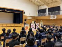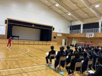 生徒会入会式・部活動紹介が行われました。最初に生徒会役員から生徒会について、委員長から各委員会の仕事内容が紹介されました。1年生は一生懸命説明する先輩の話を集中して聞いていました。後半は部活動紹介で、代表生徒が普段の活動の様子の一部を実演を交えながら紹介しました。先輩たちのかっこいい姿に時折「おー!」と声を上げながら興味深く見ていた1年生でした。この後の見学、体験を通して3年間続けられる部活動を自分で考えて選んで下さい。