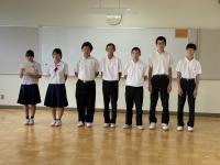 吹奏楽、ビーチバレー、卓球、陸上の表彰披露のあと、北陸大会に出場する吹奏楽部と全国大会に出場するビーチバレーの選手から意気込みを述べてもらい、全校で激励を行いました。
