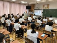 その後平和学習として、修学旅行で広島を訪れた3年生が、学んだことをスライドにまとめて発表してくれました。