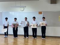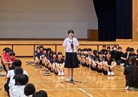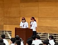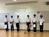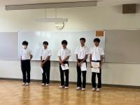 春季大会や能美中学校陸上競技大会、能美中学校相撲大会などの表彰披露のあとに、生徒会執行部から6月の心のテーマの紹介や、18日に行われる辰口クリーンプロジェクトのお知らせなどがありました。
