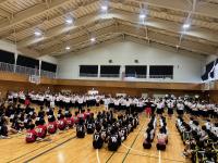 吹奏楽部の軽やかなマーチに合わせて選手が入場し、各キャプテンや部長から大会にかける決意や意気込みが語られました。これまでの練習の成果を出して勝ちにいくことはもちろん、これまで応援してくれた仲間や家族、先生への感謝の気持ちを伝えるために頑張りたいという思いが多く語られました。