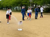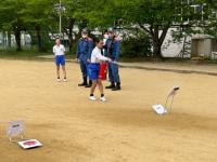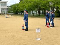 代表児童が、水消火器訓練、5年生が、煙道訓練を行いました。