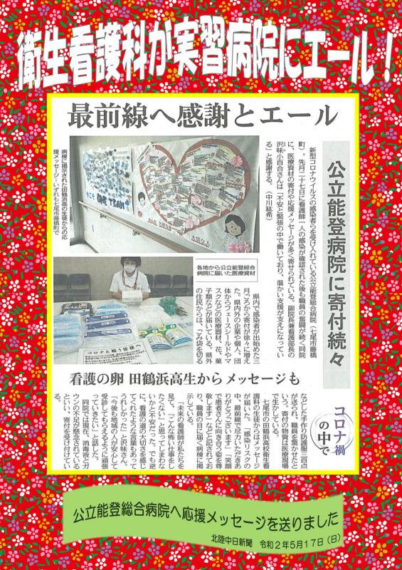 田鶴浜高等学校衛生看護科では実習病院である公立能登総合病院の職員の方々に応援メッセージを送りました。