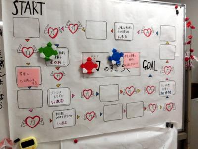 すごろくの空白部分には、対象者に応じて、力(ちから)カード(例えば、「隣の人に自己紹介する」「みんなで風船バレー5回連続達成」など)の課題を張り付けます。すごろくのようにサイコロを振って進むのも良し、じゃんけんをして勝った数だけ進むのも良し、対象者に合わせてどんな風にも自由自在に使えるゲームです。