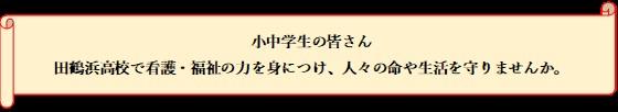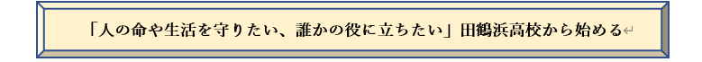 本校は、県内唯一の医療・福祉系学科をもつ専門高校です。どこよりも早く、看護師・介護福祉士の国家試験受験資格を取得できる学校です。昨年度の国家試験も、両科ともに全員受験・全員合格を果たしました。今年度も、4月10日に新入生を迎え新学期が始まりました。生徒一人一人の進路実現をめざし「チーム田鶴浜」で支援していきたいと思います。