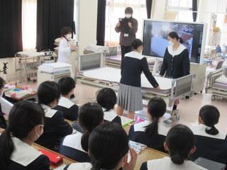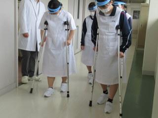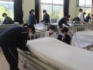 新年度が始まり、2か月が過ぎようとしています。今年度も衛生看護科1年生は初めての専門科目の勉強に生き生きと取り組んでいます。基本のベッドメイキング。ピンと張り、きれいなベッドに仕上げるのはとても難しいです。できた時には生徒たちは満面の笑顔で喜んでいました。今は感染予防がとても大切ですが、看護師を目指す生徒にとっても大切な学習です。手洗い方法や、エプロン、手袋のつけ方・外し方などを、病院実習に行く前に学んでいます。車いすや松葉杖の使い方、安全に乗り移る方法や安全確保の仕方も学んでいます。