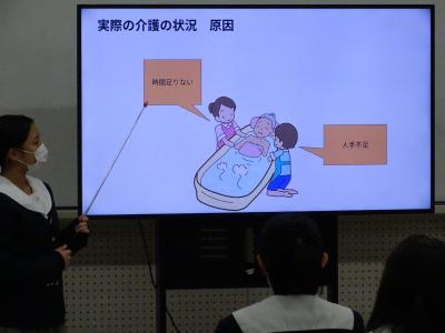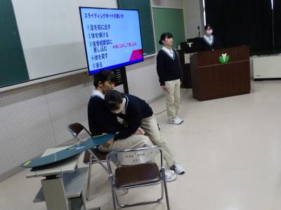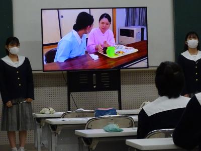 11月6日、健康福祉科3年生が学びの報告会を行いました。三年間の介護実習を通じて学んだこと、感じたことをもとに、「介護過程」「自立支援・コミュニケーション」「食事介助」「移乗介助」の4グループに分かれ、振り返り、話合い、検証して深めたことをまとめて発表しました。10分の制限時間の中で、どのグループも動画や実演を取り入れ、報告会に参加した1年生2年生とも共有し、それぞれの学びになるように工夫して発表していました。