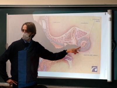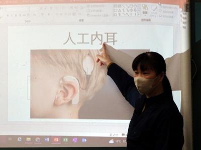 3月13日から15日にかけて、1、2年生を対象に、人工内耳についての授業を行いました。授業では実際に人工内耳を利用している教員が、人工内耳がどのようなものかなどを説明しました。