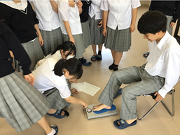 6月16日(金)石川県立大学教養教育センター体育学教室より宮口和義教授をお迎えし、1・2年生を対象に足圧分布測定やFoot活プロジェクトに関する講演会を行いました。測定や講演を通して、自己の現状を把握したり、正しい身体づくりを目指した理想の足圧分布について理解を深めたりしながら学んでいきました。