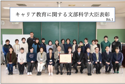 R6年1月、「文部科学大臣表彰」を受けました。キャリア教育の充実・発展に尽力し顕著な功績が認められた学校が表彰されるものです。本校の取り組みが評価された事を大変光栄に思います。これまでの教職員の尽力に加え、生徒達が応えてくれた結果であり、今後も生徒一人一人のキャリア発達を促す教育を継続していく所存です。生徒・保護者・地域・教職員が「チーム田鶴浜」として協働し、“成長を実感できる学校”・“医療・福祉施設から選ばれる学校”であり続けたい。