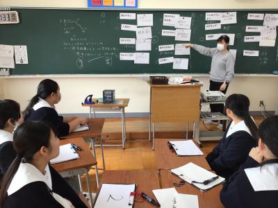 コミュニケーション技術の授業で「リフレーミング」について学びました。リフレーミングとは、見方を変えることです。実際にカルタを通して、ネガティブ見方をポジティブな見方へと変える体験をしました。何気なくネガティブな言葉を発することやネガティブな見方をすることはありますが、いざポジティブな見方に言い換えようとすると言葉がなかなか出てこず、難しく感じている様子でした。その後、自分たちの短所もポジティブな見方へ変えました。“流されやすい→協調性がある”“せっかち→時間を効率的に使える”など、自分たちで言い換えることができるようになりました。